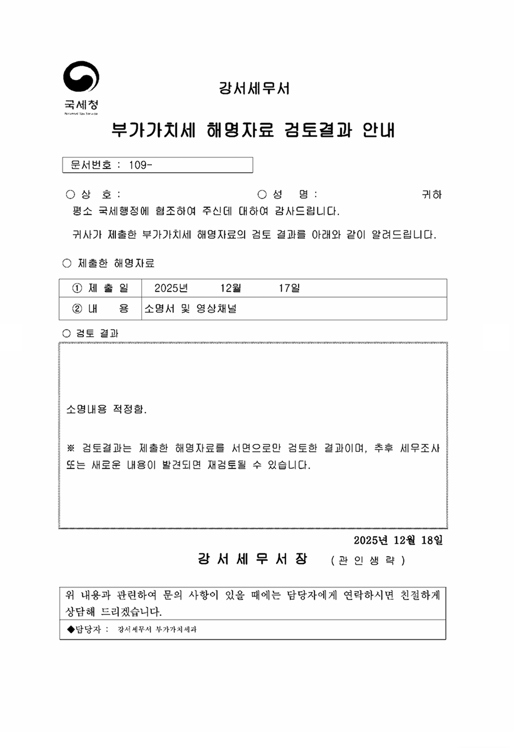세무법인 테헤란의 전문적인 대응 끝에, 관할 세무서로부터 [부가 가치세 해명자료 검토결과: 소명내용 적정함]이라는 최종 통지를 받아냈습니다.